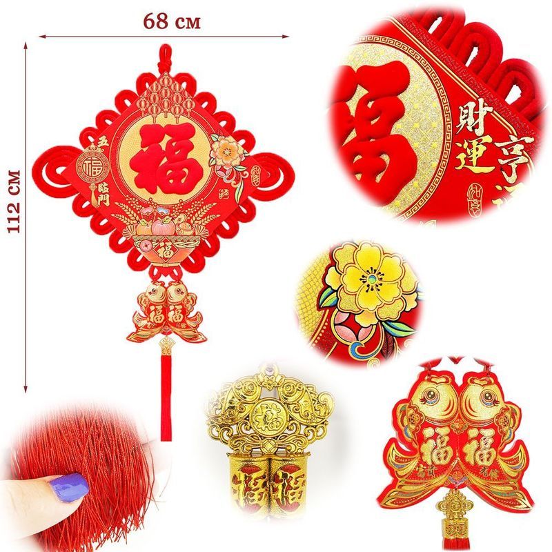 Традиционный китайский узел в форме ромба с символичным дизайном. Яркое сочетание красного бархата и золотых элементов создает эффектный акцент в интерьере.