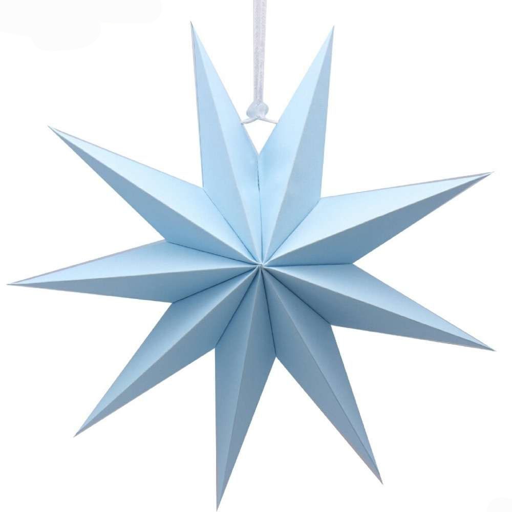 Объёмная декоративная звезда из картона диаметром 30 см с 9 лучами. Оснащена встроенным шнурком для подвешивания. Поставляется в компактном сложенном виде и быстро собирается: специальный шнурок при затягивании придаёт изделию объём и фиксирует форму. После сборки звезда остаётся устойчивой без дополнительных креплений и может использоваться многократно.