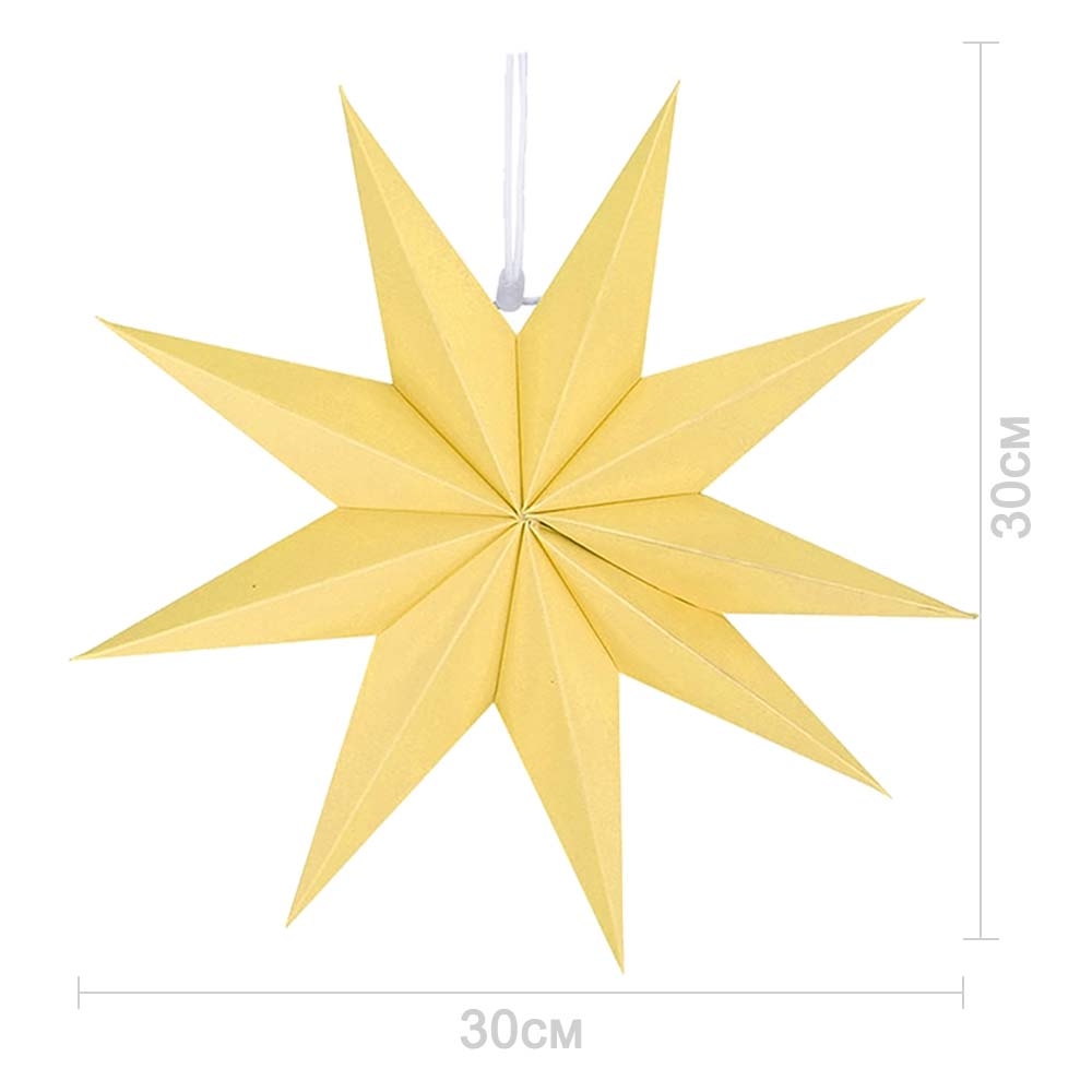 Объёмная декоративная звезда из картона диаметром 30 см с 9 лучами. Оснащена встроенным шнурком для подвешивания. Поставляется в компактном сложенном виде и быстро собирается: специальный шнурок при затягивании придаёт изделию объём и фиксирует форму. После сборки звезда остаётся устойчивой без дополнительных креплений и может использоваться многократно.